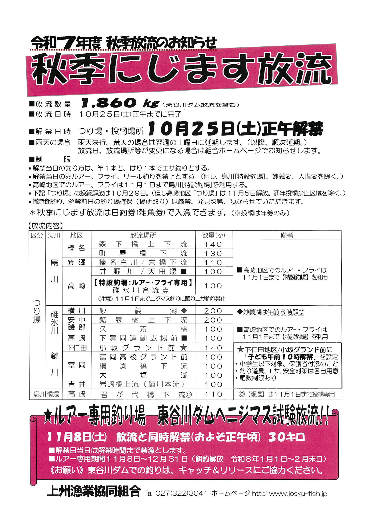 令和7年度上州漁業協同組合秋季ニジマス放流情報